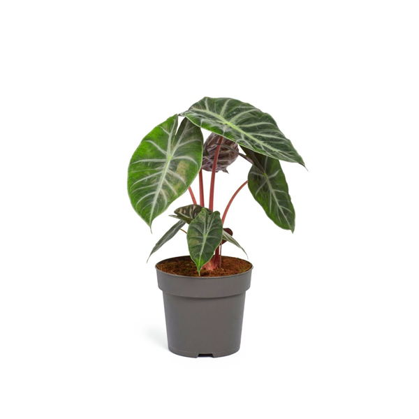 Алоказия «Pink Dragon» — экзотическое растение с блестящими зелёными листьями, характерными светло-розовыми черешками и выразительным рисунком жилок. В интерьере это настоящий акцент, который добавляет характер и свежесть.