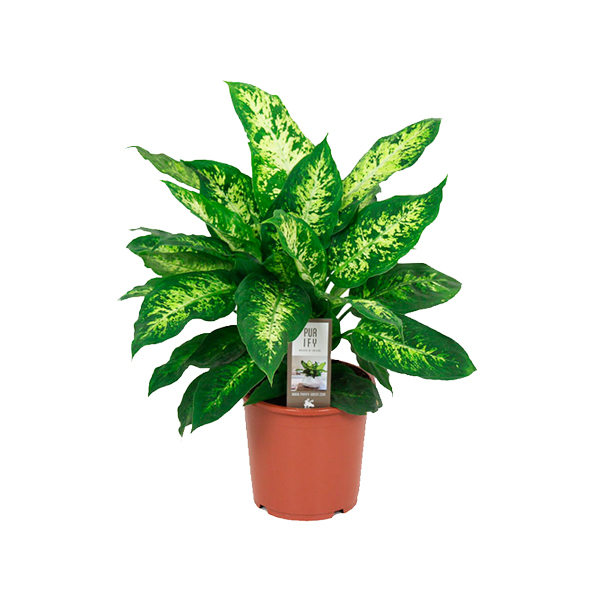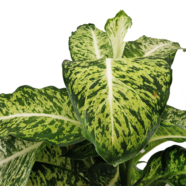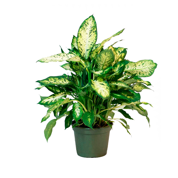 Диффенбахия «Компакта» — компактное растение с аккуратным кустиком до 60–65 см в высоту. Её листья светло‑салатового оттенка украшены тёмно-зелёными пятнами, создающими стильный мраморный узор.